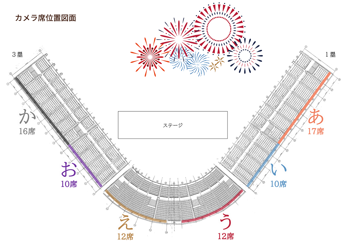 • カメラマン席以外の有料観覧席においてはカメラ用三脚、一脚、自撮り棒等の使用は禁止となりますので予めご了承ください。カメラは手持ちでの撮影にご協力ください。