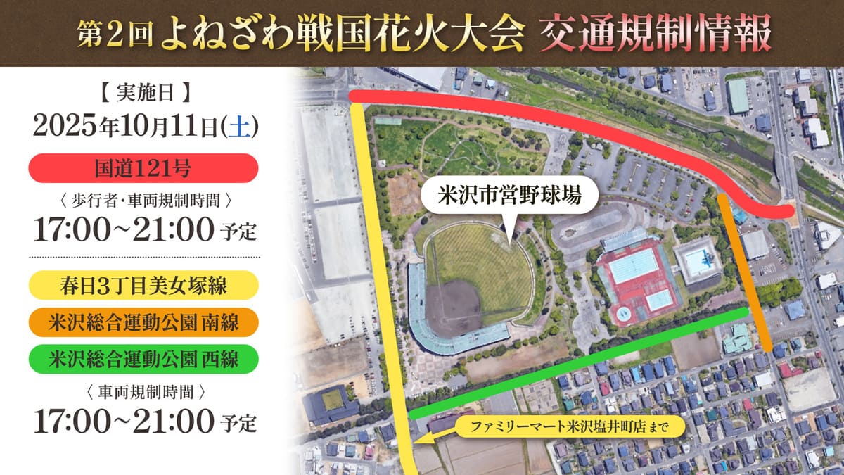 よねざわ戦国花火大会当日、以下の時間帯において交通規制が実施されます。