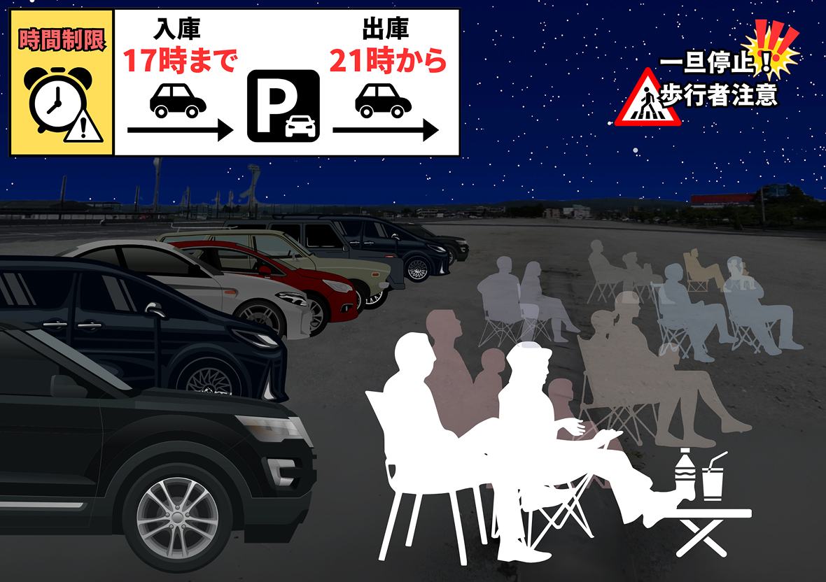 • 出庫につきましては花火大会終了後の道路清掃、安全確認の後、21:00以降での出入口開放を予定しております。十分にご理解いただきますようよろしくお願いいたします。